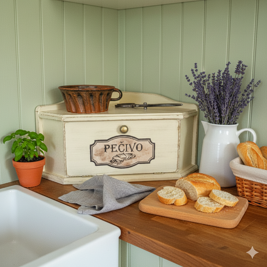 Dřevěný rohový chlebník z masivního dřeva se štítkem s nápisem "Pečivo" ve starobylém stylu je vyroben z kvalitního dřeva v provedení slonová kost s jemně hnědou patinou. Uvnitř chlebníku je ponecháno surové dřevo. Z venku je chlebník ošetřen lakem pro styk s potravinami. Jeho rohové provedení skvěle šetří místo na kuchyňské lince, protože jej lze umístit do nevyužitelných koutů.