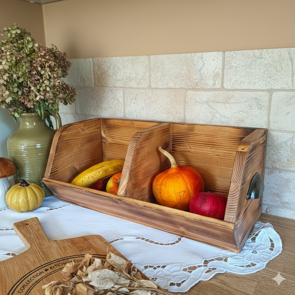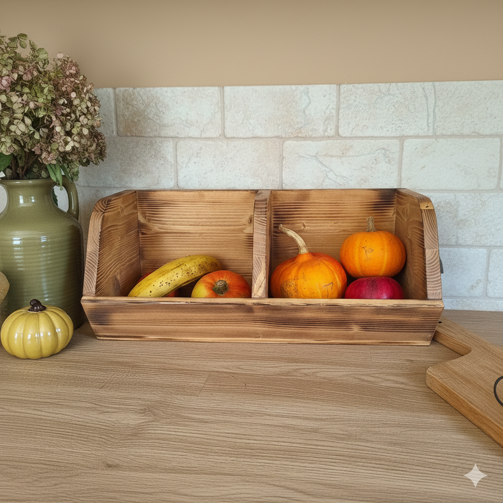 Dřevěná bedýnka na ovoce a zeleninu je praktický a stylový doplněk pro vaši kuchyni. Ručně vyrobená z kvalitního dřeva a opálená pro jedinečný vzhled. Bedýnka nabízí dostatek prostoru pro uskladnění čerstvých potravin. Je to nejen funkční, ale i dekorativní prvek, který v interiéru vynikne díky svému rustikálnímu designu.