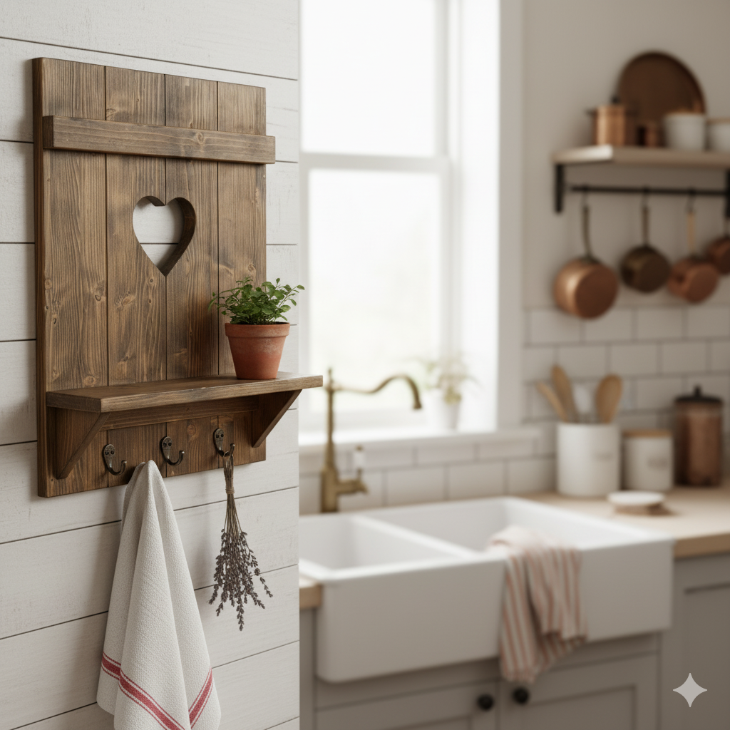 Tato dřevěná rustikální polička s výřezem srdce, poličkou a třemi háčky je ideálním doplňkem do rustikálního nebo venkovského interiéru. Romantický design s vyřezaným srdcem dodává prostoru nádech nostalgie a pohostinnosti. Polička poskytuje praktický úložný prostor pro drobné dekorace nebo předměty, zatímco tři háčky jsou ideální pro zavěšení klíčů, šál nebo jiných drobností. Vyrobena z kvalitního dřeva s důrazem na ruční zpracování. Tato polička je skvělým kouskem pro vylepšení jakéhokoliv interiéru.