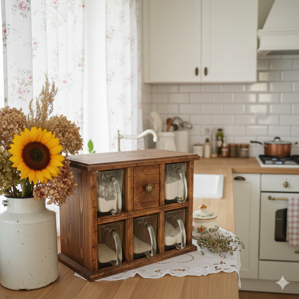 Dřevěná rustikální skřínka na 5 retro skleněných dóz s jedním mini šuplíčkem je ideální kombinací elegance a funkčnosti. Tato ručně vyrobená skřínka z kvalitního dřeva, s autentickým rustikálním designem, nabízí praktické úložné řešení pro vaše kuchyňské ingredience. Díky této stylové skřínce získáte nejen praktický úložný prostor, ale i jedinečný dekorativní prvek. Skleněné dózy nejsou součástí! Koncipováno na dózy velikosti 19,5x12x9 cm.