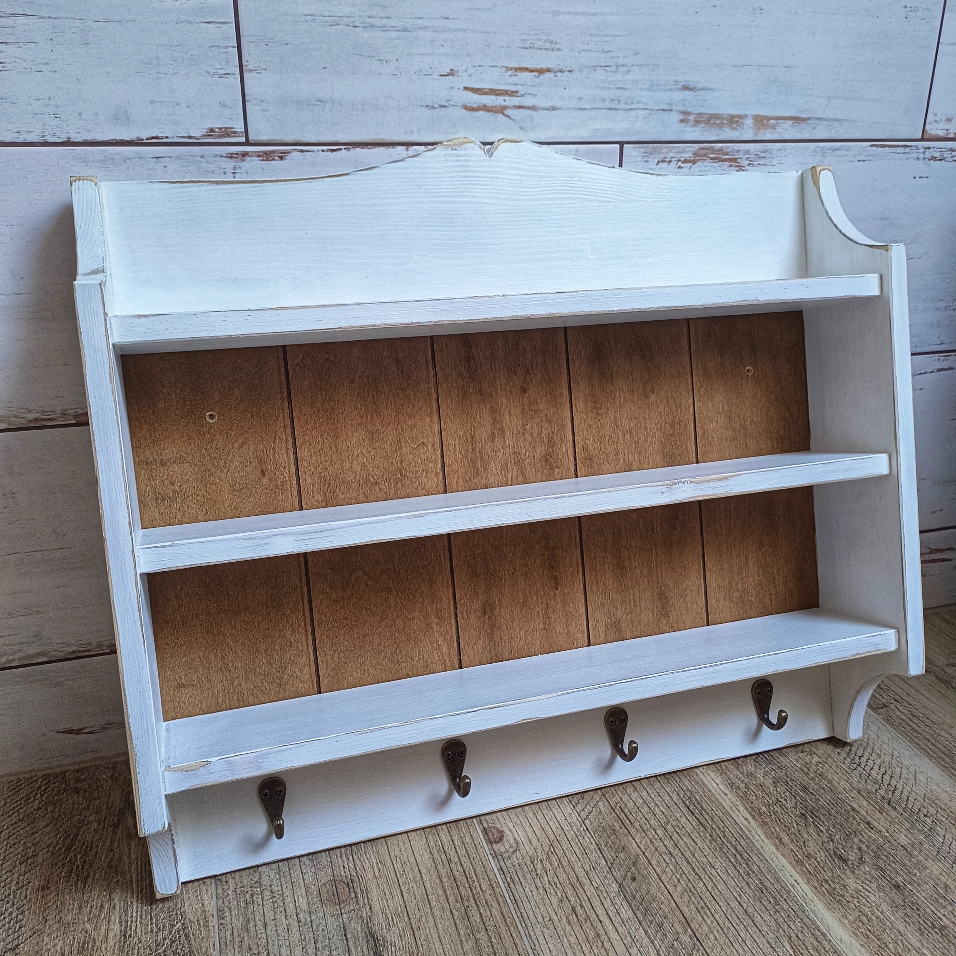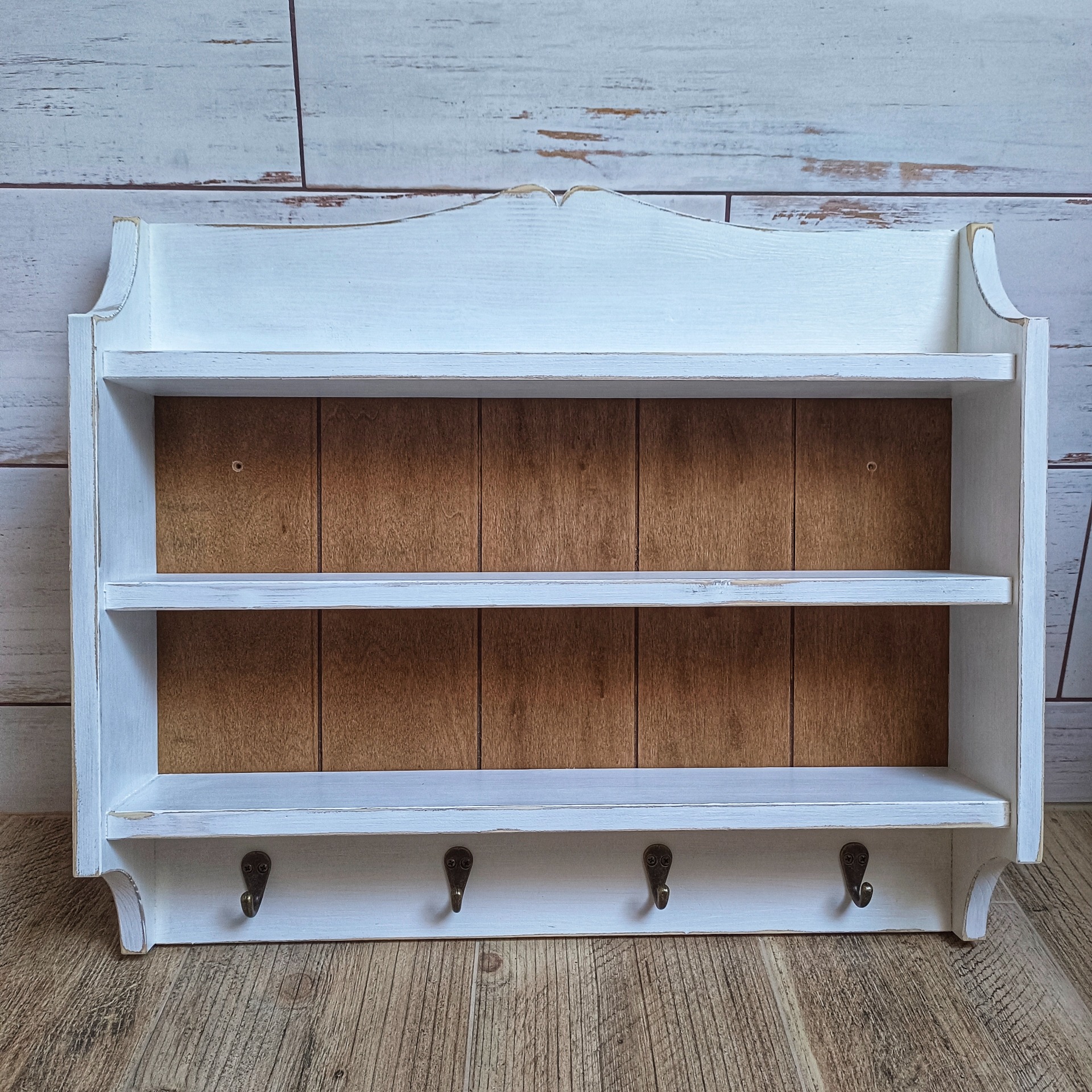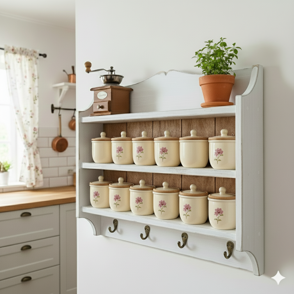 Police na kořenky či jiné drobnosti ve vintage stylu je zhotovena v bílé barvě s lehkou hnědou patinou. Je ideálním řešením pro uložení a organizaci vašich kořenek nebo jiných drobných předmětů. Byla vyrobena z kvalitního masivního dřeva a její vzhled přinese do vaší kuchyně nádech vintage stylu. Polička je nejen funkční, ale i dekorativní.