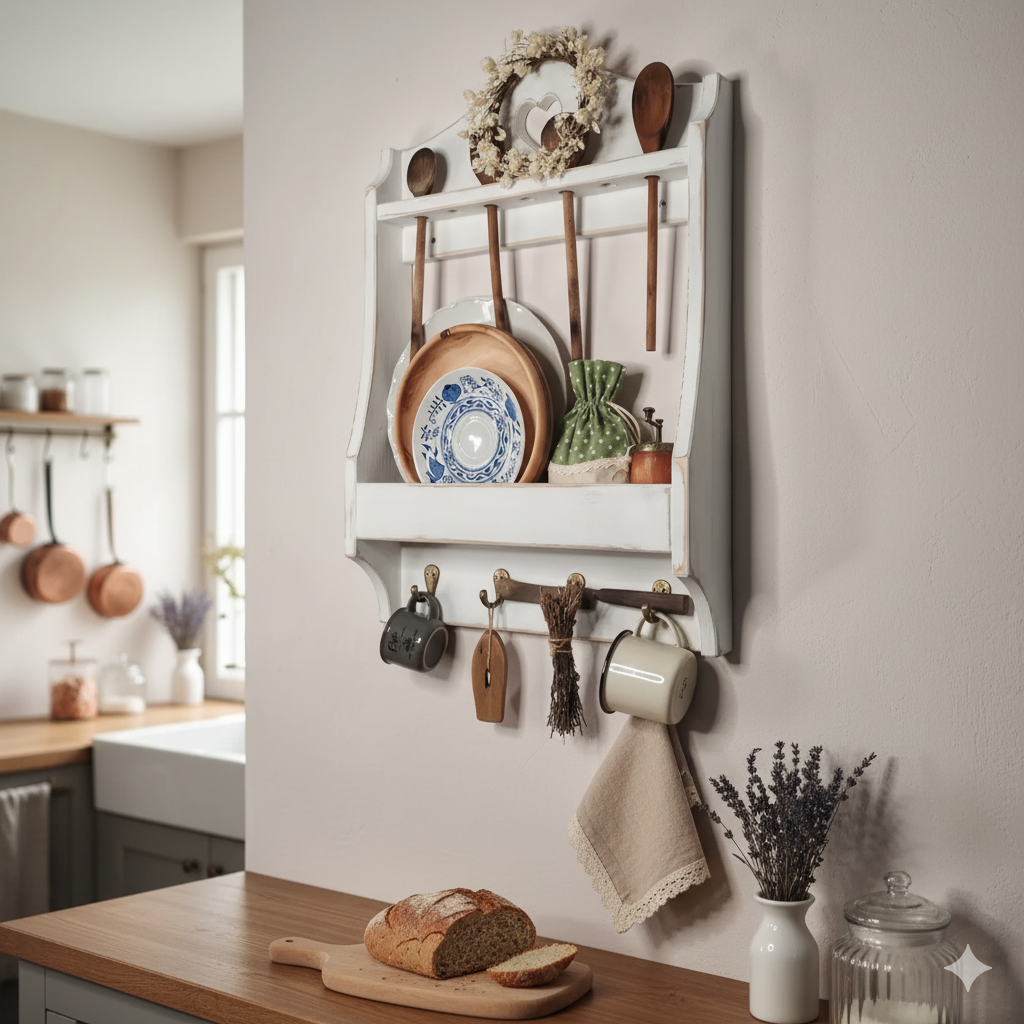 Tato dřevěná vintage polička je perfektním řešením pro organizaci drobných kuchňských potřeb. Poličk aje vybavena jednou malou policí na kořenky nebo jiné drobnosti, čtařmi praktickými háčky na zavěšení kuchyňských nástrojů a sedmi otvory na vařečky. Vyrobena z kvalitního přírodního dřeva. Polička přináší do vaší kuchyně elegantní a funkční doplněk. Je ideální pro uložení kuchňského náčiní, které chcete mít vždy po ruce.