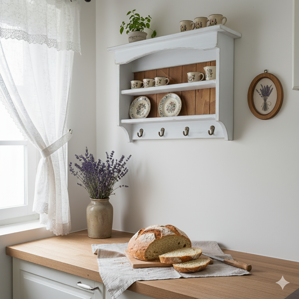 Dřevěná vintage police se dvěma poličkami a čtyřmi háčky přináší do vašeho domova styl a praktičnost. Její vintage design jistě ocení každá žena milující tento styl. Police má dvě úložné poličky pro malé předměty a čtyři háčky, které poskytují prostor pro zavěšení ručníků, utěrek nebo jiných kuchyňských potřeb a dekorací.