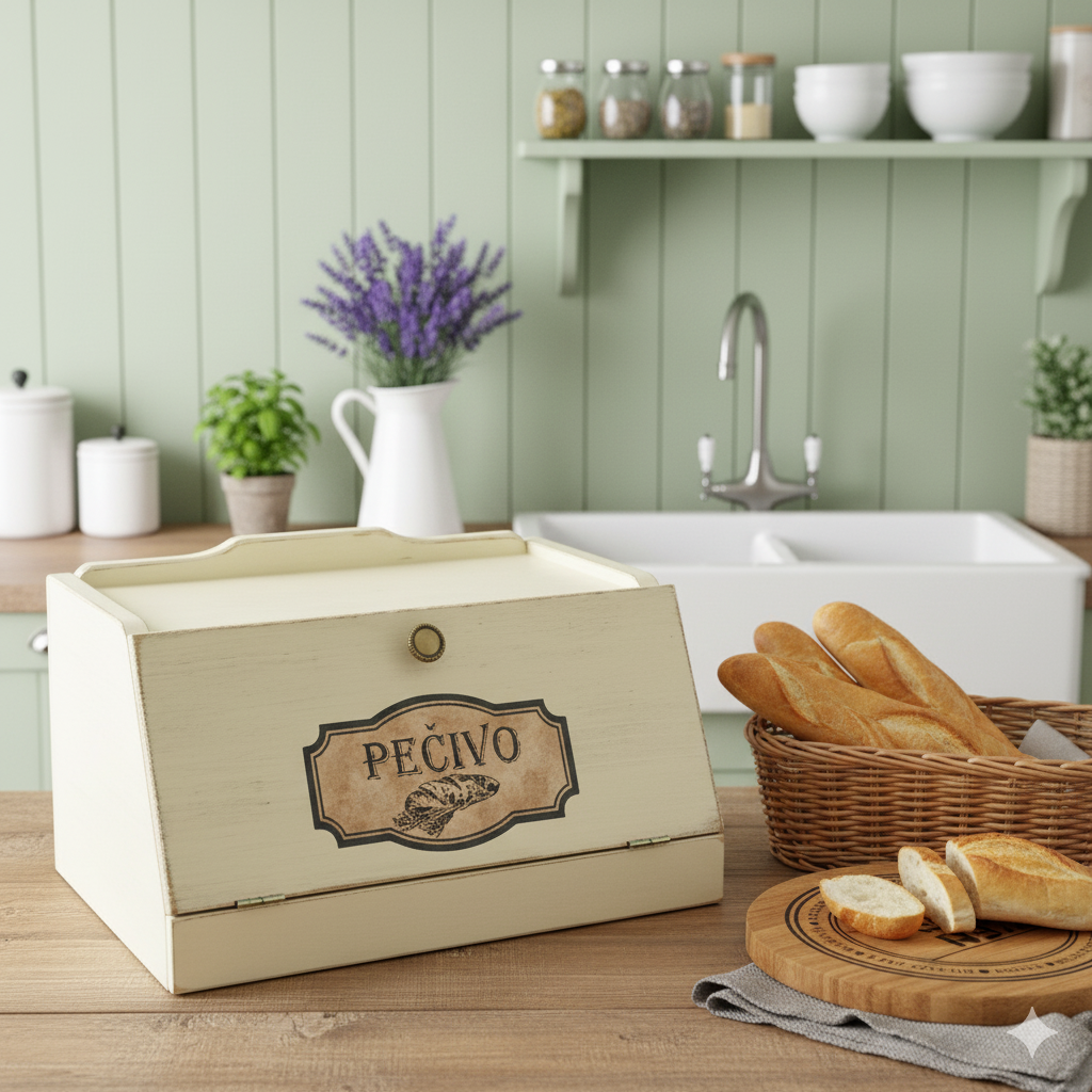 Dřevěný chlebník z masivního dřeva ve vintage stylu. V barevném provedení slonová kost s jemně hnědou patinou. Je ozvláštněn štítkem s nápisem "Pečivo". Uvnitř chlebníku je ponecháno surové dřevo. Tento chlebník nejen chrání vaše pečivo před vysycháním, ale zároveň se stane nádherným dekoračním prvkem.