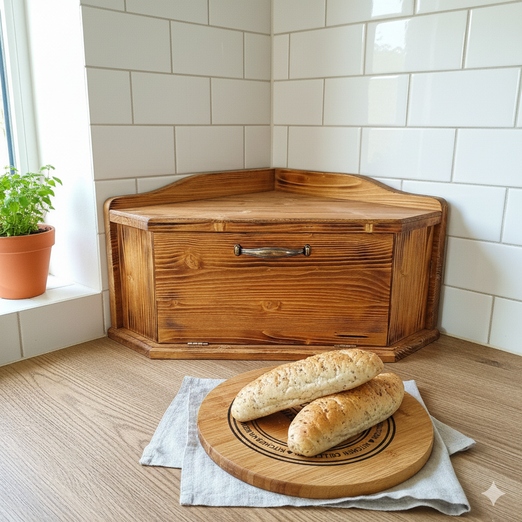Tento dřevěný rohový chlebník v jedinečném opáleném provedení přináší do vaší kuchyně kousek přírodní krásy. Díky rohovému tvaru šetří místo a zároveň slouží jako výrazný dekorativní prvek.