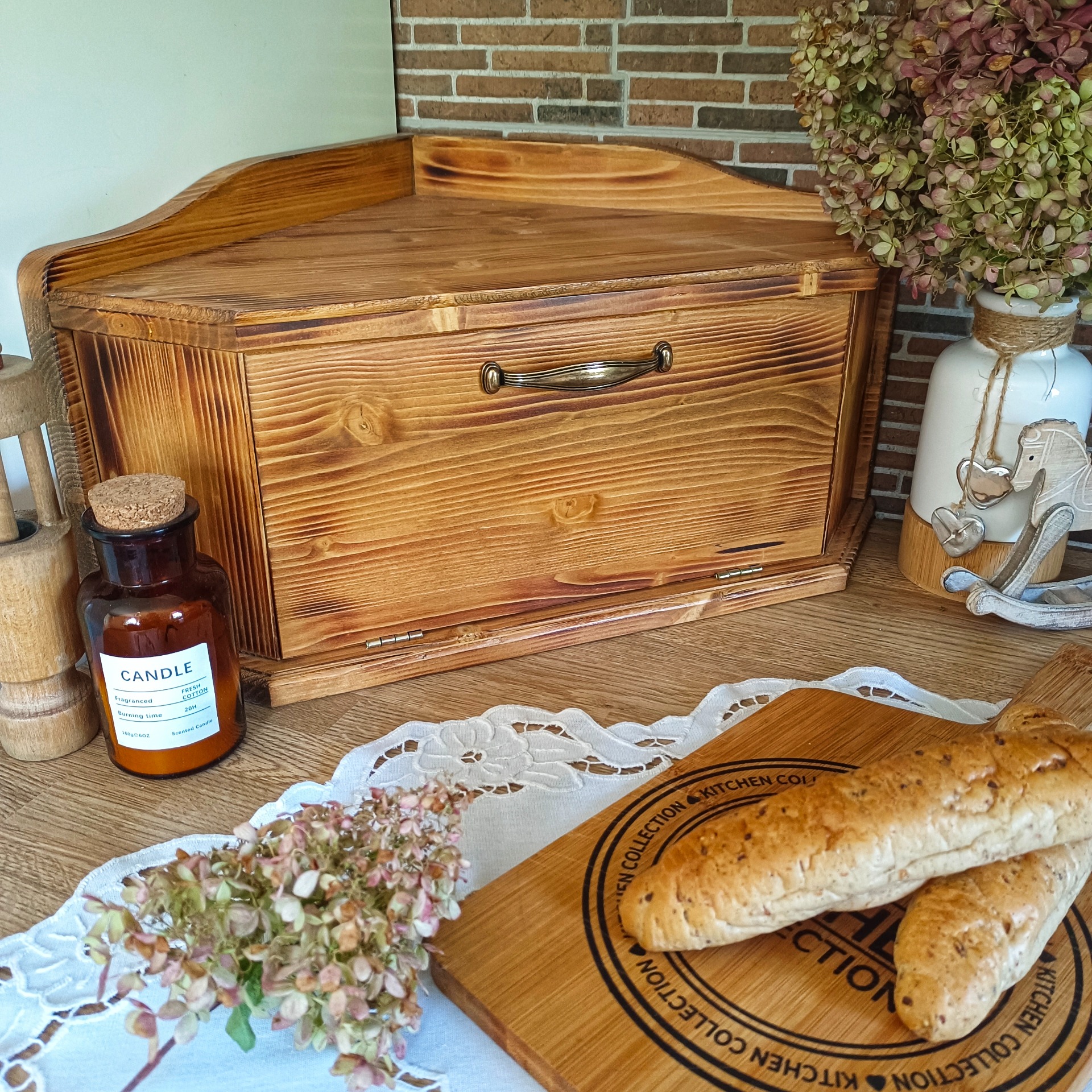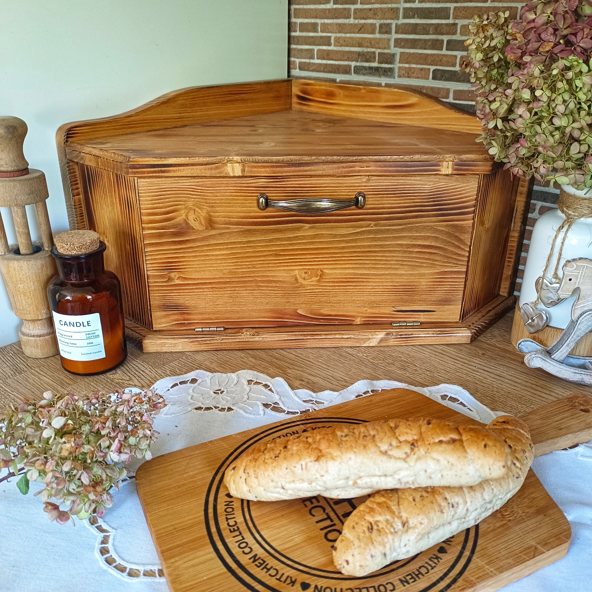 Tento dřevěný rohový chlebník v jedinečném opáleném provedení přináší do vaší kuchyně kousek přírodní krásy. Díky rohovému tvaru šetří místo a zároveň slouží jako výrazný dekorativní prvek.