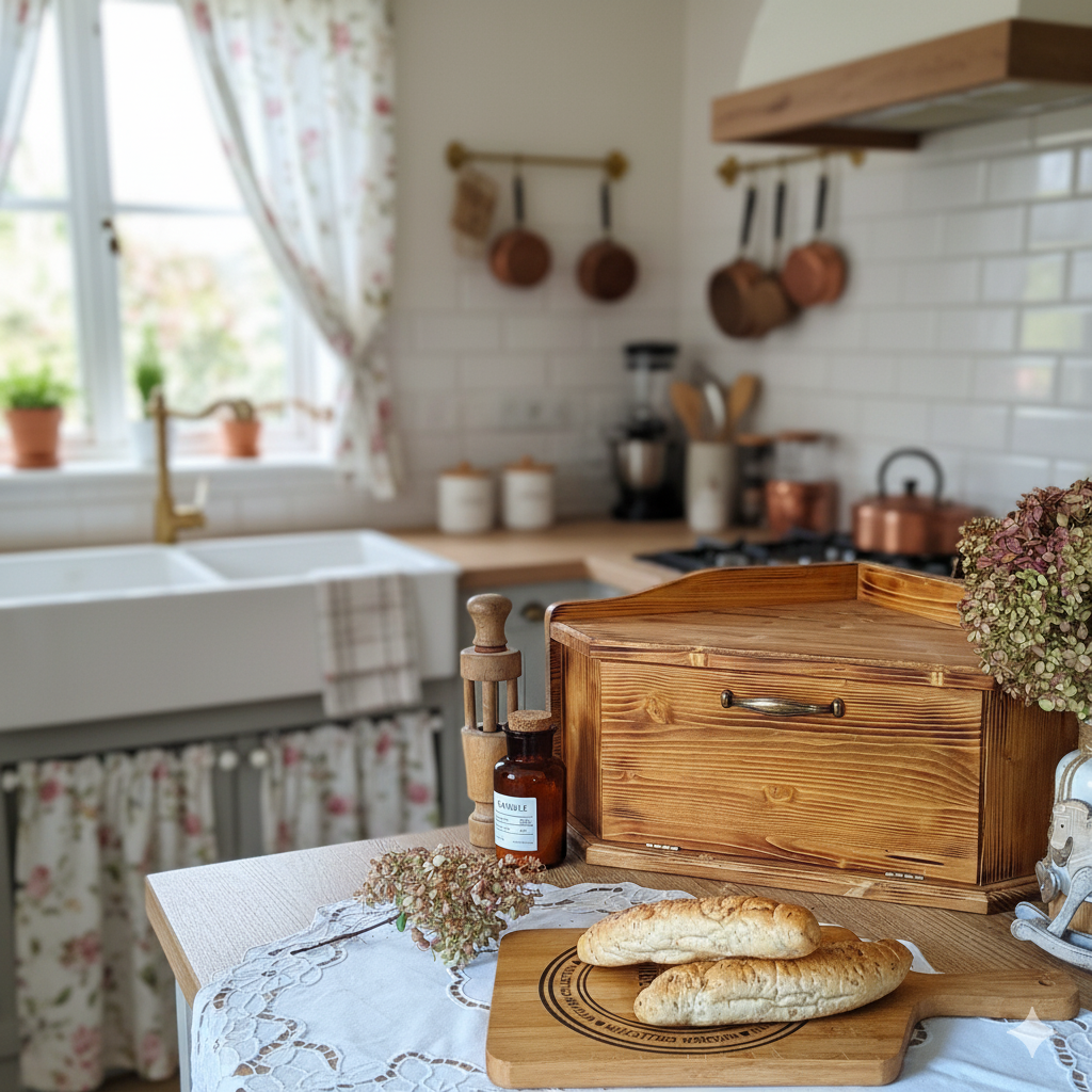 Bronzová úchytka dodává chlebníku elegantní a starobylý vzhled, který vynikne v rustikální, venkovské i moderní kuchyni.