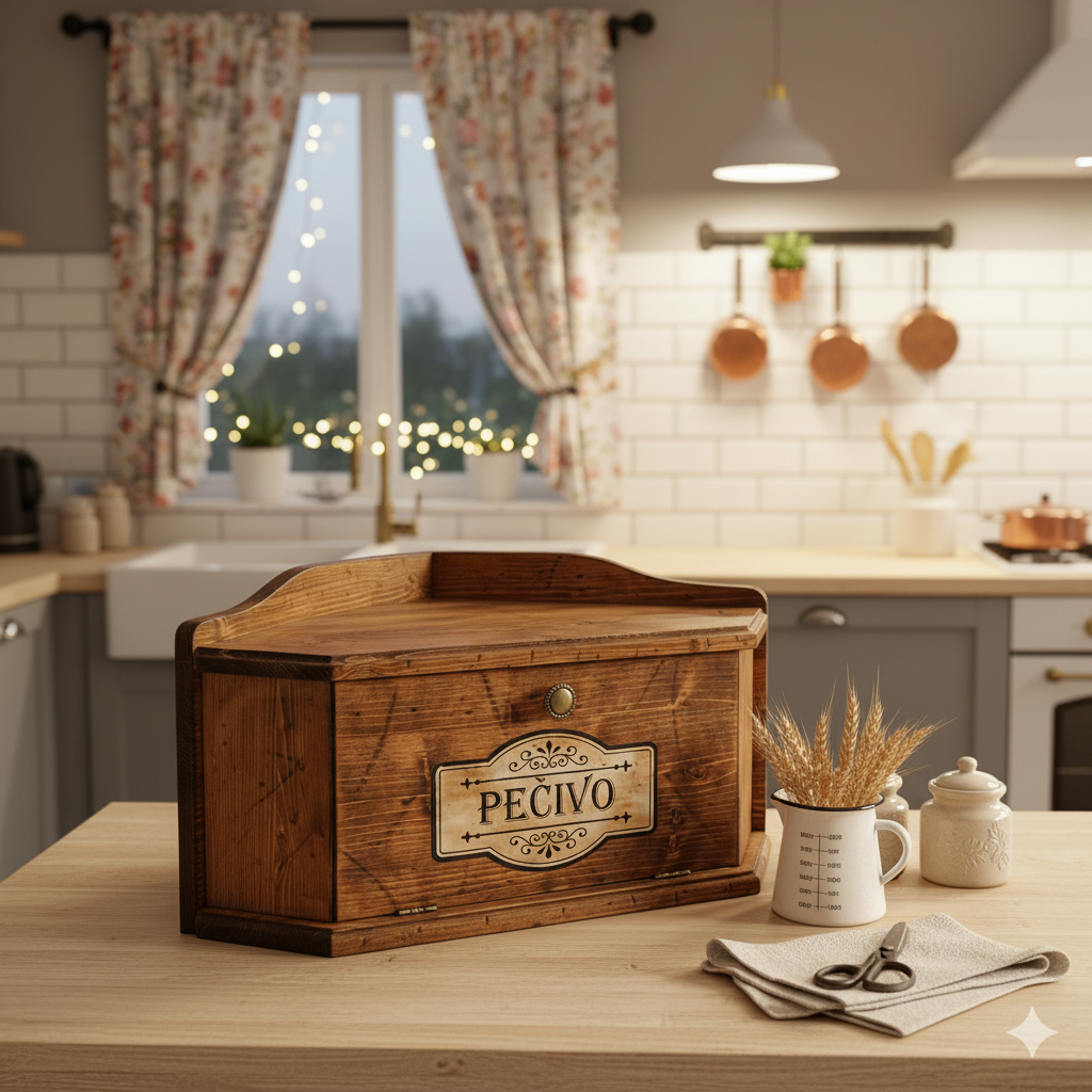 Dřevěný rustikální rohový chlebník s nápisem "Pečivo" ve starobylém štítku je vyroben z kvalitního smrkového dřeva. Uvnitř chlebníku je ponecháno surové dřevo. Z venku ošetřen lakem pro styk s potravinami. Jeho rohové provedení skvěle šetří místo na kuchyňské lince, protože jej lze umístit do nevyužitelných koutů.