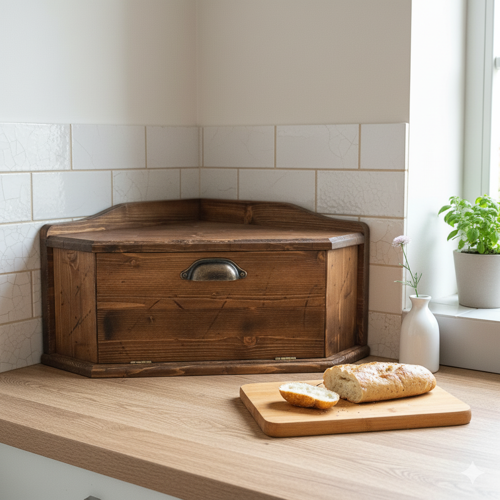 Stylový rustikální rohový chlebník vyrobený u nás v Dílně pod javorem ručně z masivního smrkového dřeva. Zdobí jej jednoduchá bronzová úchytka a uvnitř chlebníku je ponechánu surové dřevo.