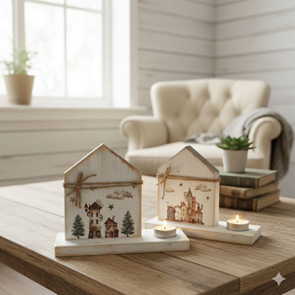 Tento vintage dřevěný svícen s domečkem na jednu čajovou svíčku (v ceně) je ideálním doplňkem pro milovníky útulné atmosféry a přírodních materiálů. Svícen je ručně vyroben z kvalitního dřeva a přináší jemné teplé světlo do každého interiéru. Perfektní jako dárek pro milovníky vintage stylu.