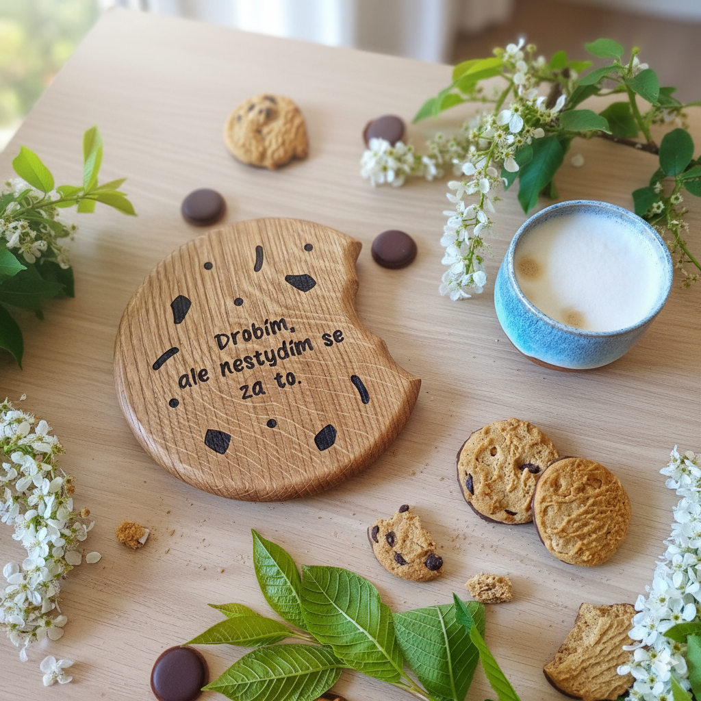 dřevěný podnos ve tvaru nakousnuté sušenky přináší vtip, styl a poctivé české