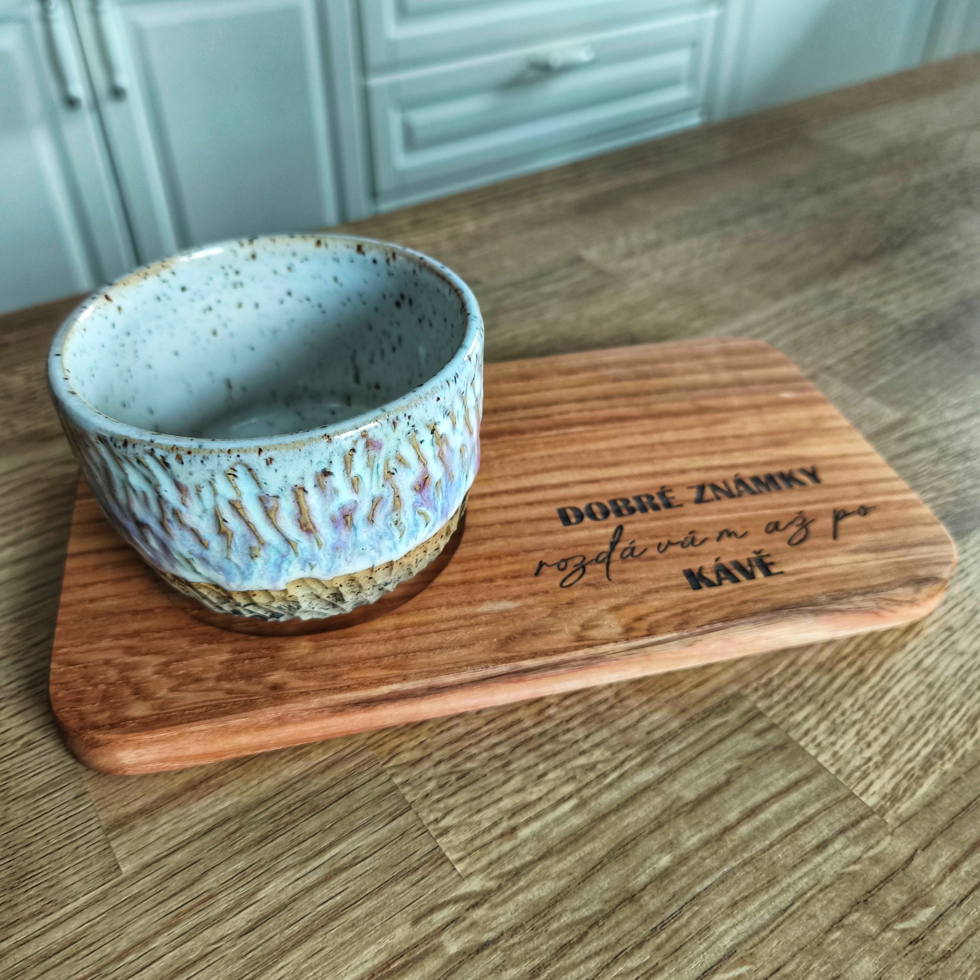 to pravé. Elegantní dřevěný design z kvalitního českého jasanu doplňuje vtipný gravírovaný text "dobré známka rozdávám až po kávě".