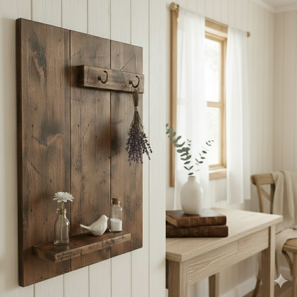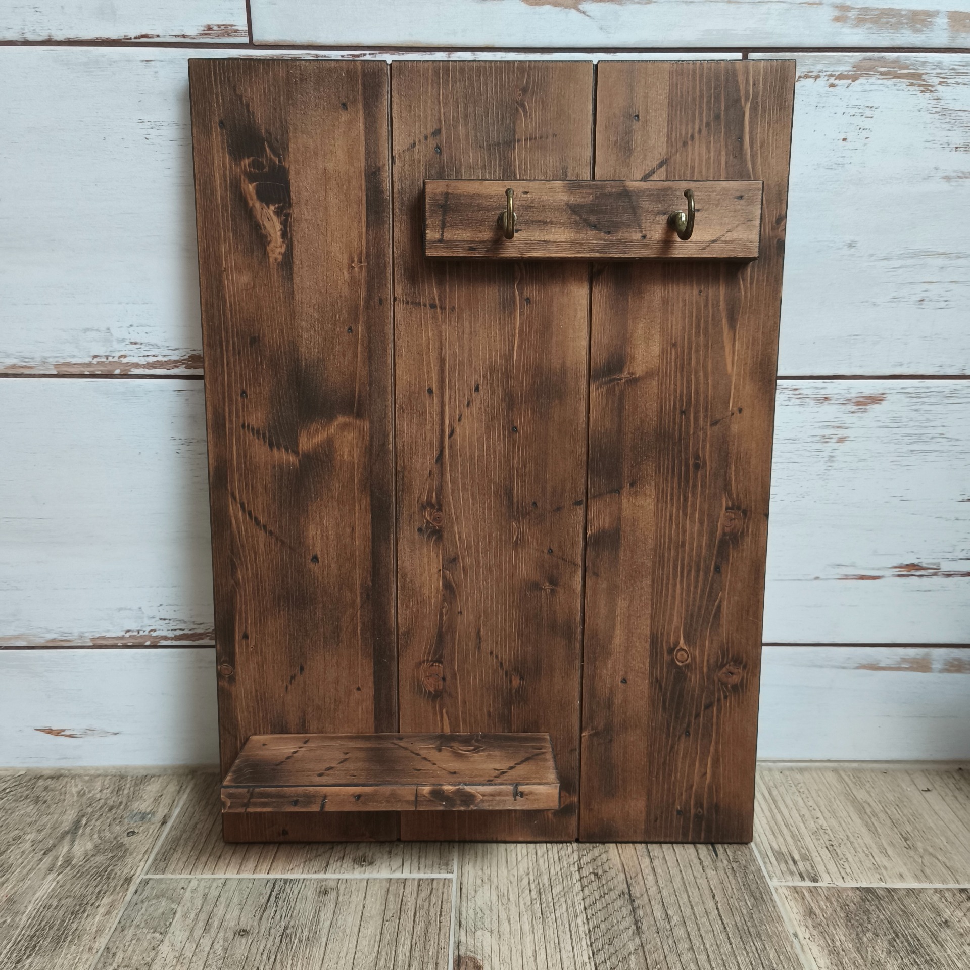 Náš rustikální dřevěný věšák s poličkou je vyráběný ručně v naší malé rodinné dílně. Každý kus dřeva má svůj jedinečný vzhled, strukturu a kresbu – proto je každý kus originál.