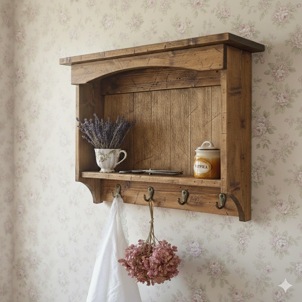 Tato dřevěná rustikální police přinese do vašeho domova originální styl a praktičnost. Její rustikální design jistě ocení každá žena milující tento retro styl. Tato kuchyňská police má jeden úložný prostor a čtyři háčky, které poskytují prostor pro zavěšení ručníků, utěrek nebo jiných kuchyňských potřeb a dekorací.