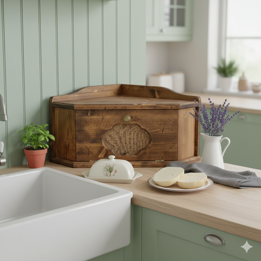 Hledáte praktické a zároveň krásné řešení pro uchování vašeho pečiva? Tento rohový chlebník z přírodního dřeva je ideální volbou. Díky větrací mřížce udržuje optimální vlhkost a pečivo zůstává déle čerstvé.