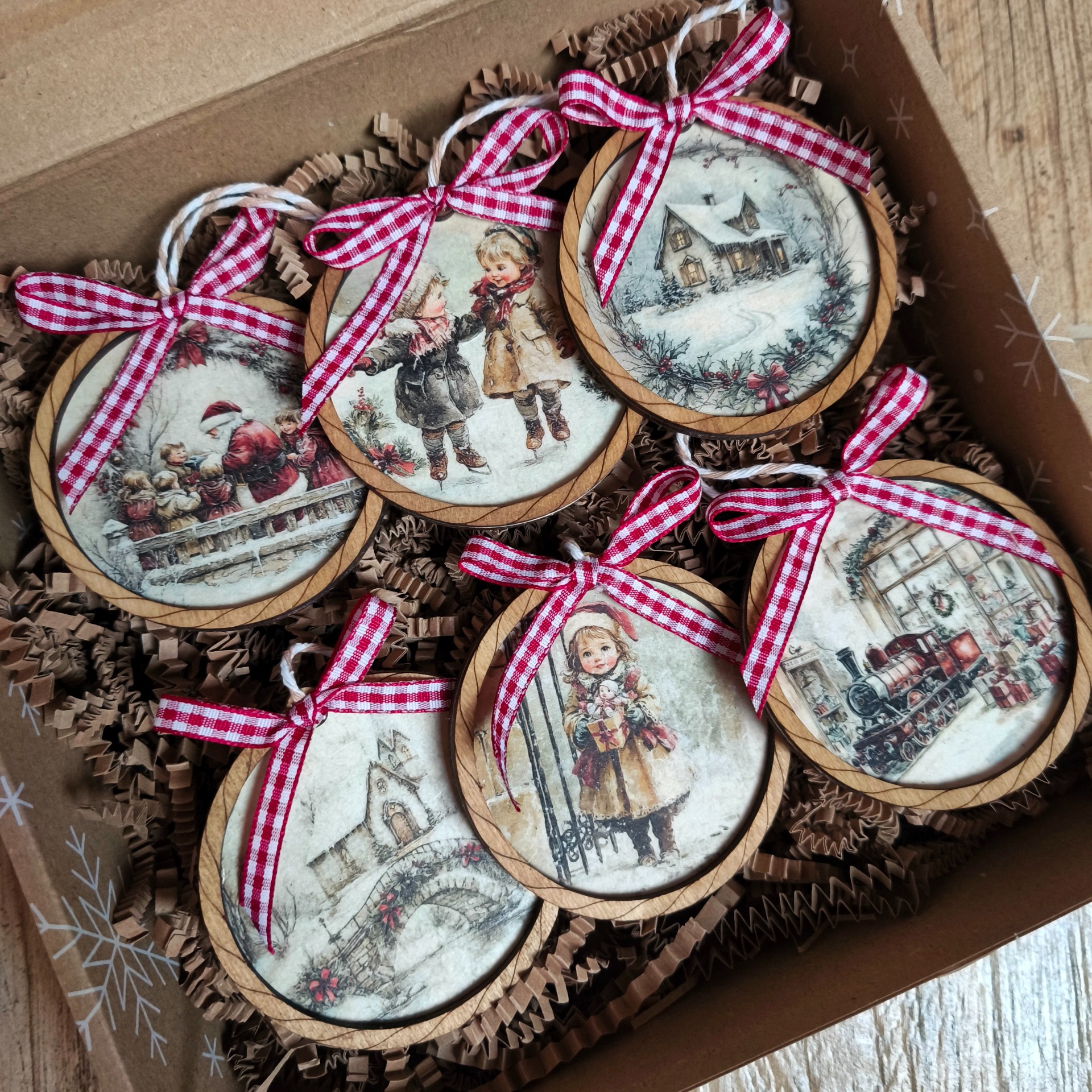 Vytvořte doma kouzelnou vánoční atmosféru s naší šestidílnou sadou dřevěných vánočních ozdob. Každá ozdoba je laserově vypálená z kvalitní překližky a ozdobena obrázkem s vánočním retro motivem.