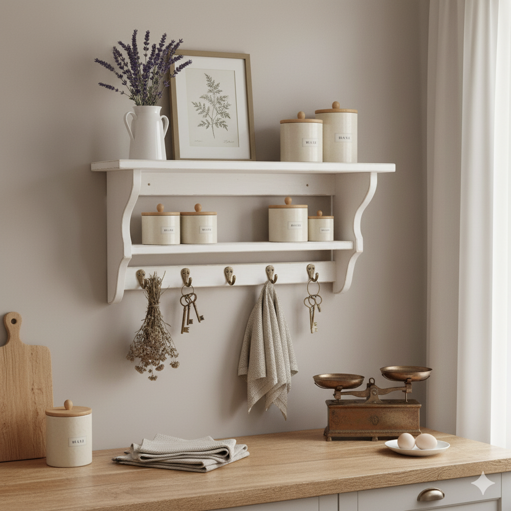 Vytvořte si doma útulnou atmosféru venkovského bydlení s touto bílou dřevěnou poličkou v rustikálním stylu.