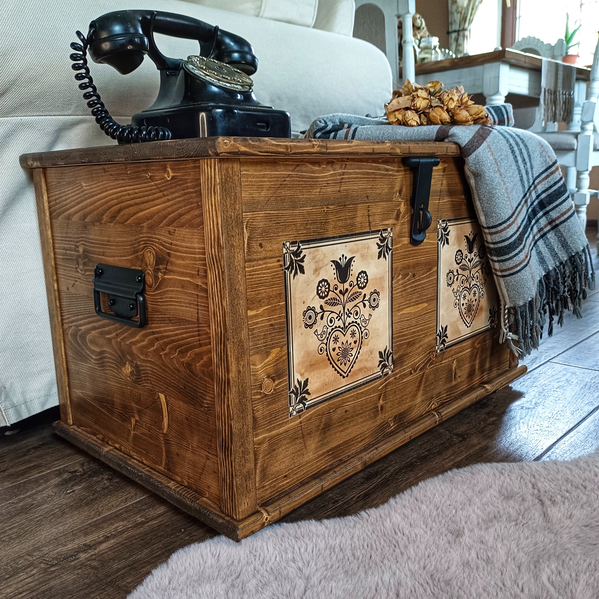 Tato dřevěná truhla je nejen praktickým úložným prostorem, ale také výrazným dekorativním prvkem vašeho domova. Můžete ji využít na deky, polštáře, hračky nebo třeba jako stylový konferenční stolek.