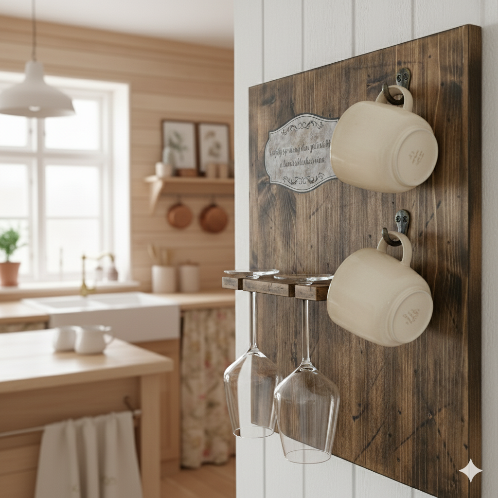 Hledáte praktický a zároveň stylový doplněk pro svou kuchyň nebo jídelnu? Náš rustikální držák na hrnky a skleničky je ideálním řešením pro všechny, kteří milují kávu i víno. Dekorační deska s nápisem "Každý dobrý den začíná kávou a končí vínem" nabízí prostor pro dva hrnečky a dvě skleničky, čímž skvěle propojuje váš ranní a večerní rituál. Tento dekorativní a funkční prvek oživí každý interiér a dodá mu osobitost.